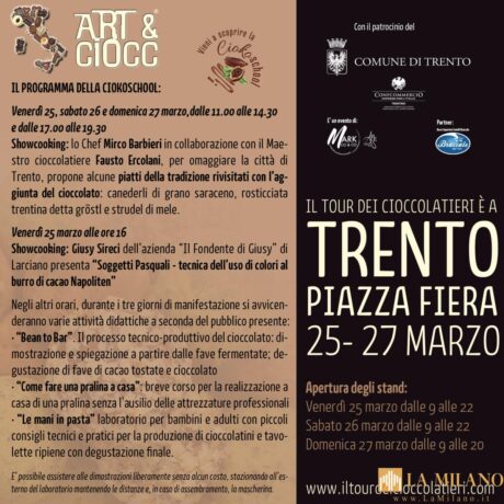 Trento, ART & CIOCC® Il Tour dei Cioccolatieri: la VI edizione in Piazza Fiera con le più golose specialità regionali. La sesta edizione della grande festa itinerante dedicata al cioccolato artigianale vedrà la partecipazione di cioccolatieri provenienti da ben 7 diverse regioni; dal Piemonte, passando per Lombardia, Veneto, Toscana, Umbria, Calabria, fino alla Sicilia, ART […]