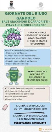 Trento: dal 6 al 18 novembre arrivano a Gardolo le “Giornate del riuso”. Arrivano anche a Gardolo nel mese di novembre le “Giornate del riuso”, organizzate dalla Circoscrizione nelle sale Giacomoni e Caracristi in piazza Lionello Groff. Tre le giornate di raccolta. Lunedì 6 dalle 8 alle 12, martedì 7 dalle 14 alle 17 e […]